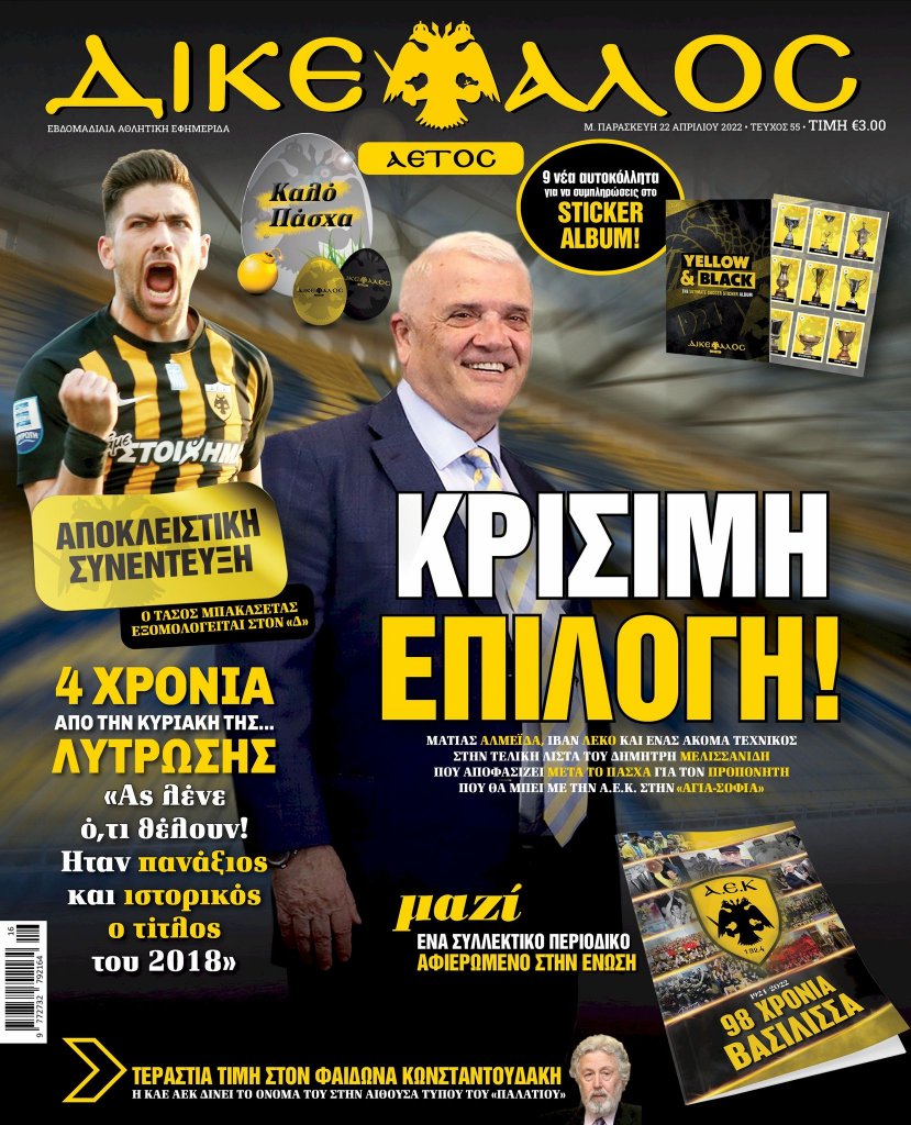 Διαβάστε επίσης: Αποκλειστικά ρεπορτάζ, θέματα και αναλύσεις, αρθρογραφία από τους καλύτερους ρεπόρτερ της Α.Ε.Κ., πλούσια παρασκήνια, δείτε αποκλειστικές φωτογραφίες από την εξέλιξη των έργων στην «Αγιά-Σοφιά» και μάθετε τα πάντα για όλα τα αθλήματα του «κιτρινόμαυρου» πλανήτη. Και όπως πάντα ένα απολαυστικό δισέλιδο από τον μυθικό Φ.Κ.