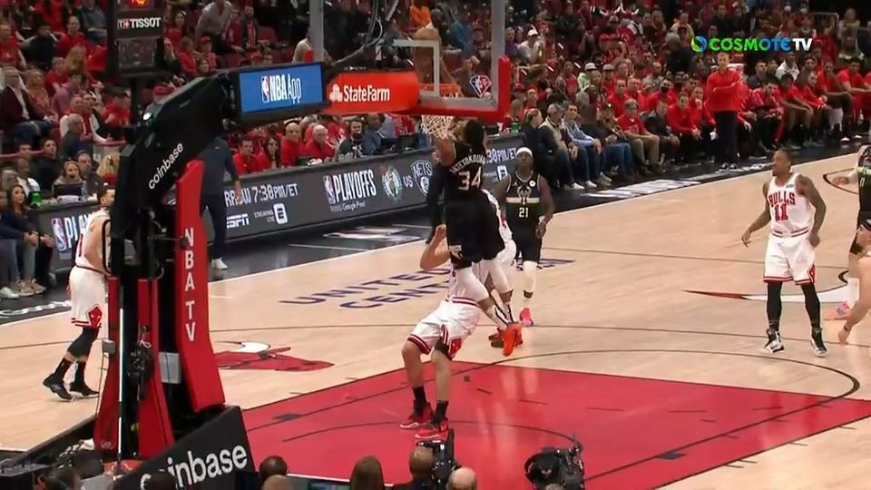 Ο Αντετοκούνμπο έκλεψε την μπάλα και τελείωσε, εξαιρετικά, τη φάση, ενθουσιάζοντας τον αδελφό του, που ήταν στον πάγκο