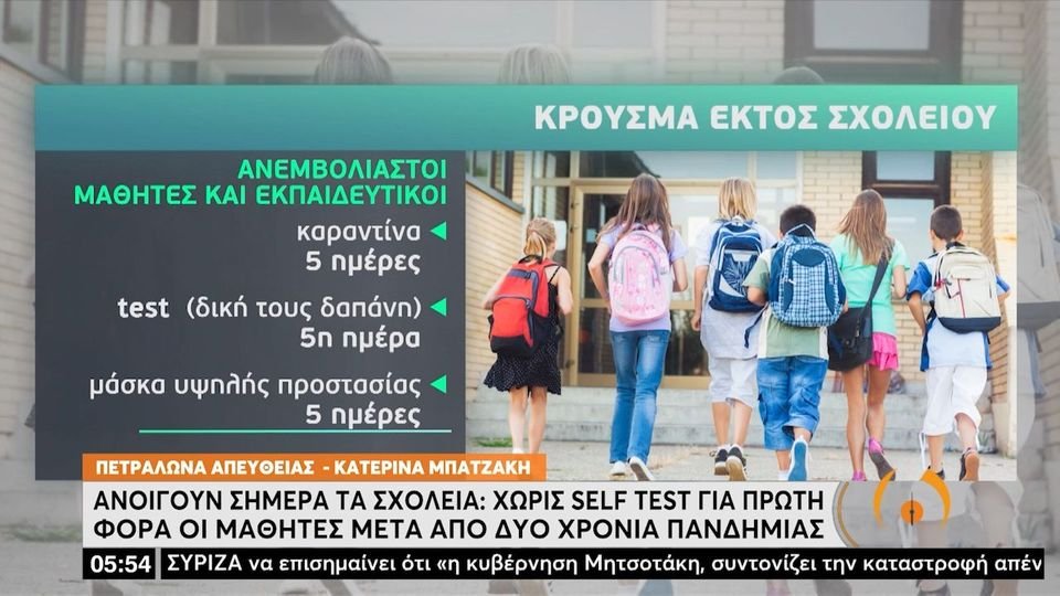 Ανοίγουν σημερα τα σχολεία: Χωρίς self test για πρώτη φορά οι μαθητές μετά από 2 χρόνια πανδημίας (VIDEO)
