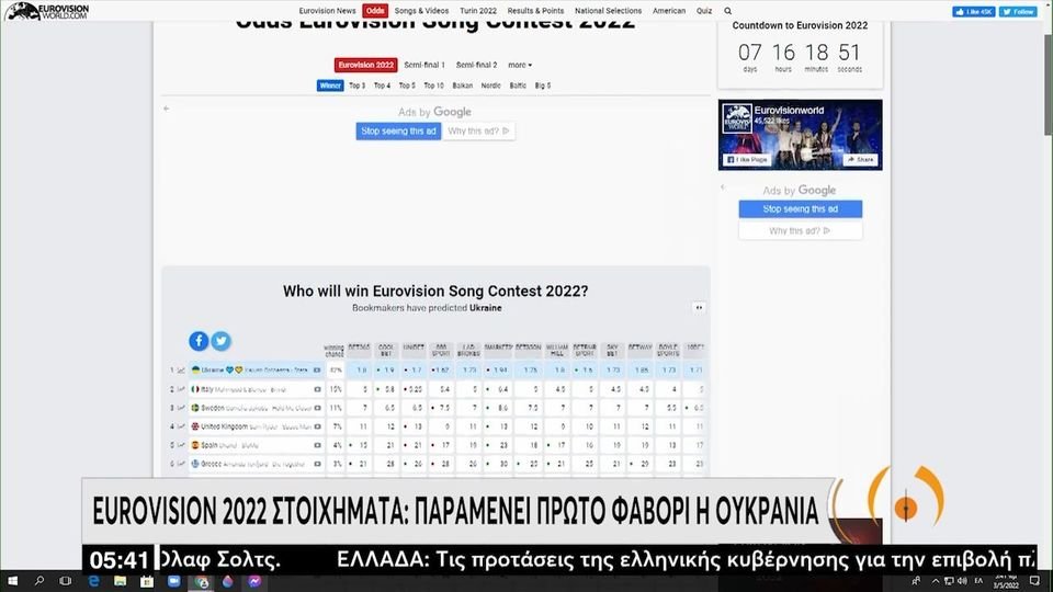 Eurovision 2022 στοιχήματα: Αυτή η χώρα παραμένει πρώτο φαβορί (VIDEO)