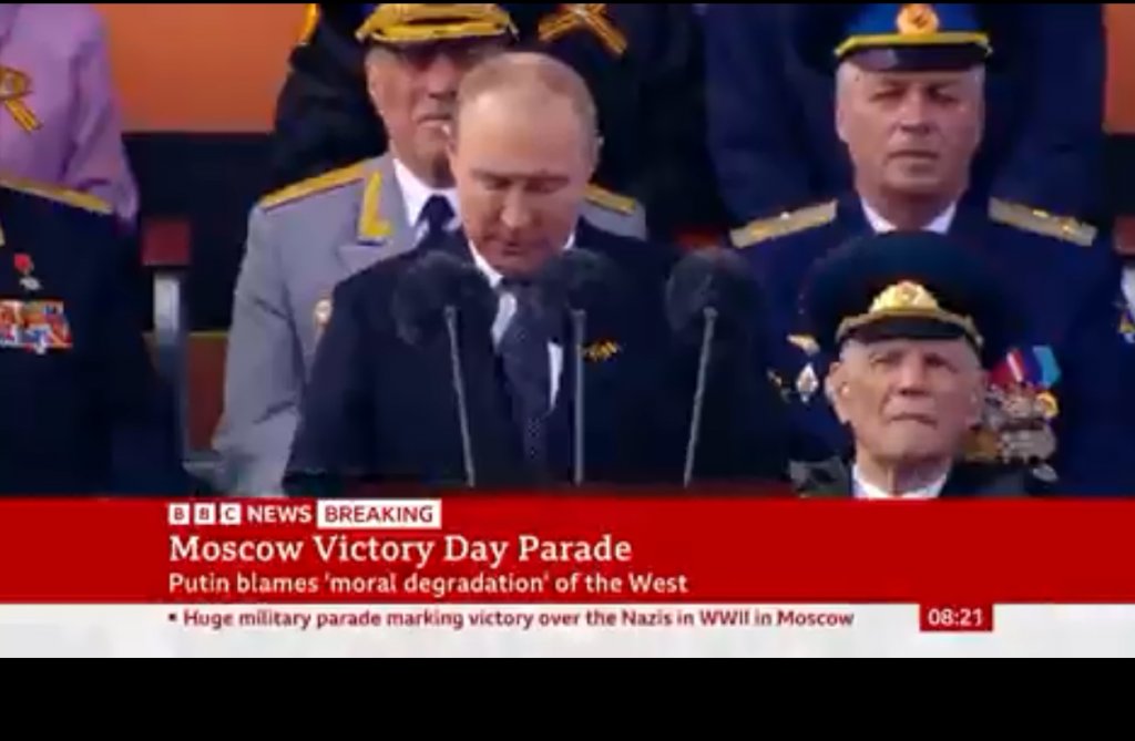 Η Δύση ετοιμαζόταν να εισβάλει στη γη μας, δήλωσε σήμερα ο Ρώσος πρόεδρος Βλαντίμιρ Πούτιν, στην ομιλία του κατά την Ημέρα της Νίκης επί της ναζιστικής Γερμανίας στο Β' Παγκόσμιο Πόλεμο. Το ΝΑΤΟ δημιουργούσε απειλές στα σύνορά μας, ενώ η Δύση δεν ήθελε να εισακούσει τη Ρωσία, δήλωσε ο Πούτιν. Ο ίδιος πρόσθεσε ότι η ειδική στρατιωτική επιχείρηση στην Ουκρανία ήταν ένα απαραίτητο και χρονικά κατάλληλο μέτρο, η μοναδική σωστή απόφαση.