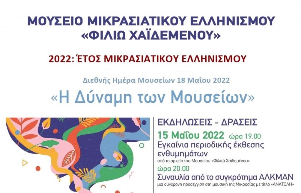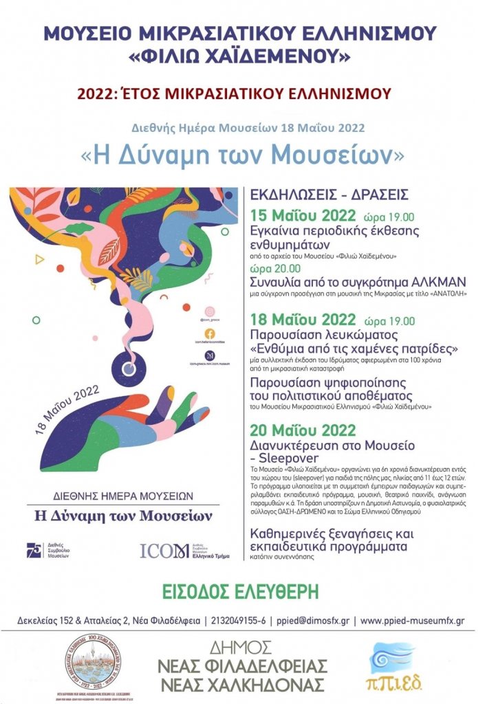 Το Μουσείο Μικρασιατικού Ελληνισμού «Φιλιώ Χαϊδεμένου» του Δήμου Νέας Φιλαδέλφειας – Νέας Χαλκηδόνας συμμετέχει στις εκδηλώσεις μνήμης για τα 100 χρόνια από τη Μικρασιατική καταστροφή και με αφορμή την διεθνή ημέρα Μουσείων 2022 διοργανώνει τον μήνα Μάιο τις παρακάτω εκδηλώσεις και δράσεις: