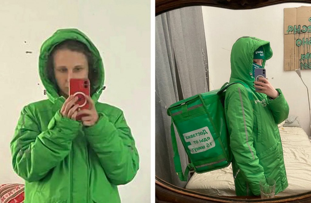 Η σύντροφός της και συνάδελφός της, μέλος των Pussy Riot, Λιούσια Στέιν, μοιράστηκε μια φωτογραφία της Αλιόχινα, ντυμένη με την πράσινη στολή του Delivery Club και φορώντας ένα σακίδιο διανομής τροφίμων.