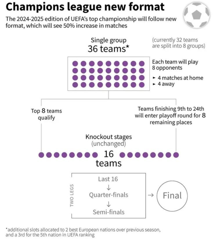 Όταν θα τελειώνουν και οι 8 αγωνιστικές θα σχηματίζεται μία ενιαία βαθμολογία και για τις 36 ομάδες με βάση τα αποτελέσματά τους. Οι πρώτες οκτώ ομάδες θα προκρίνονται απευθείας στη φάση των 16 της διοργάνωσης. Οι ομάδες από τη θέση 9-16 θα αντιμετωπίζουν σε διπλά νοκ άουτ ματς τις ομάδες από τις θέσεις 17-24 με τη ρεβάνς στην έδρας τους και οι οκτώ νικήτριες θα προκρίνονται στη φάση των 16, όπου θα περιμένουν οι 8 πρώτες. Οι ομάδες από 25 -36 φυσικά θα αποκλείονται.