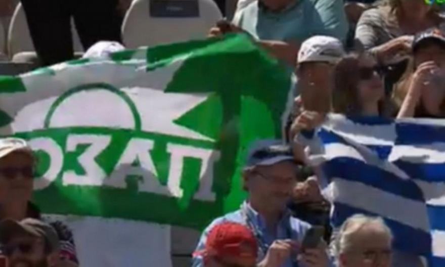 Σε πλάνο που έγινε λοιπόν στην εξέδρα μετά από κάποιο κερδισμένο του πόντο, ο φακός συνέλαβε ανάμεσα στις ελληνικές σημαίες και μια με τον πράσινο ήλιο του ΠΑΣΟΚ.