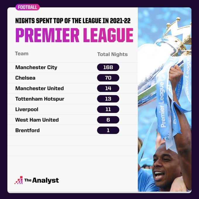 Η πρωταθλήτρια Μάντσεστερ Σίτι, όπως ήταν αναμενόμενο, πέρασε τις περισσότερες ημέρες στην κορυφή με την Τσέλσι να ακολουθεί στον σχετικό πίνακα.