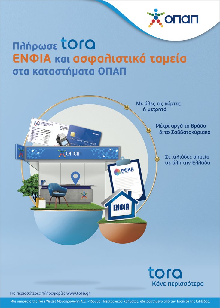 Λίγες ημέρες έχουν απομείνει για την πληρωμή της πρώτης δόσης του ΕΝΦΙΑ, με την προθεσμία να λήγει στις 31 Μαΐου. Τα καταστήματα ΟΠΑΠ προσφέρουν στους φορολογούμενους μια εύκολη λύση για την πληρωμή των δόσεων, μέσω της υπηρεσίας πληρωμών της Tora Wallet. Χωρίς ουρές και αναμονή, οι φορολογούμενοι μπορούν να πληρώσουν τον ΕΝΦΙΑ σε περίπου 3.000 καταστήματα ΟΠΑΠ σε όλη τη χώρα, είτε με χρήση μετρητών είτε μέσω χρεωστικής, πιστωτικής ή προπληρωμένης κάρτας.