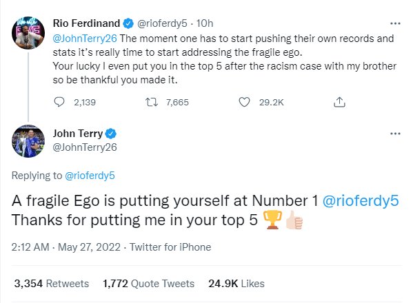 Ακολούθησε νέα απάντηση από τον Τζον Τέρι: "Εύθραυστο εγώ έχει όποιος βάζει τον εαυτό του στο νούμερο ένα. Ευχαριστώ που με έβαλες στο Top 5 σου"