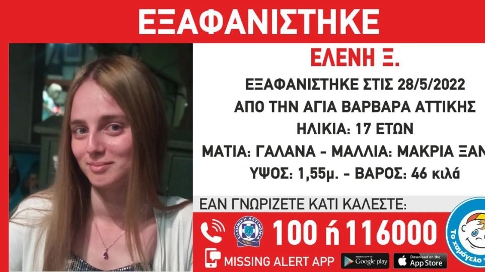 Στις 28/05/22, πρωινές ώρες, εξαφανίστηκε από την περιοχή της Αγίας Βαρβάρας Αττικής, η Ελένη Ξ. 17 ετών.