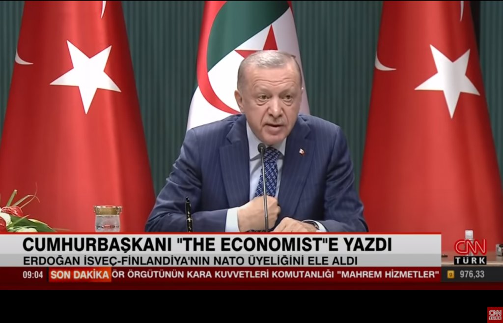 Αναφερόμενος στο συνεχιζόμενο βέτο της Τουρκίας στην ένταξη Φινλανδίας-Σουηδίας στο ΝΑΤΟ, ο Ερντογάν είπε ότι η χώρα του δεν έχει λάβει σαφείς προτάσεις που να ικανοποιούν την ανησυχία του για ζητήματα ασφαλείας. «Πώς μπορεί η Τουρκία να εγκρίνει τα αιτήματα Σουηδίας και Φινλανδίας για ένταξη στο ΝΑΤΟ όταν οι συνεργάτες των τρομοκρατών κυκλοφορούν ελεύθεροι και πραγματοποιούν διαδηλώσεις εκεί;», είπε ο Τούρκος πρόεδρος.