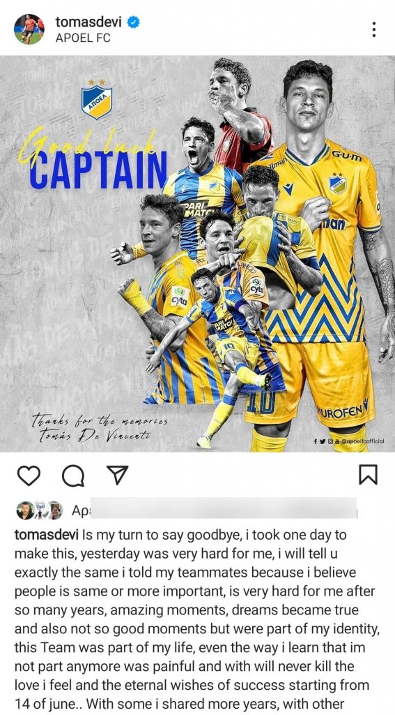 Mεσω των Social και με ένα συγκινητικό μήνυμα ο Τόμας Ντε Βινσεντι είπε αντίο στο ΑΠΟΕΛ.