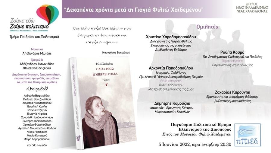 Ο Δήμος Νέας Φιλαδέλφειας – Νέας Χαλκηδόνας την Κυριακή 5 Ιουνίου 2022 διοργανώνει δημόσια ανάγνωση και τιμητική εκδήλωση στην μνήμη της γιαγιάς της πόλης μας, της Γιαγιάς Φιλιώς με αφορμή την συμπλήρωση 15 ετών από τον θάνατό της (4 Ιουνίου 2007).
