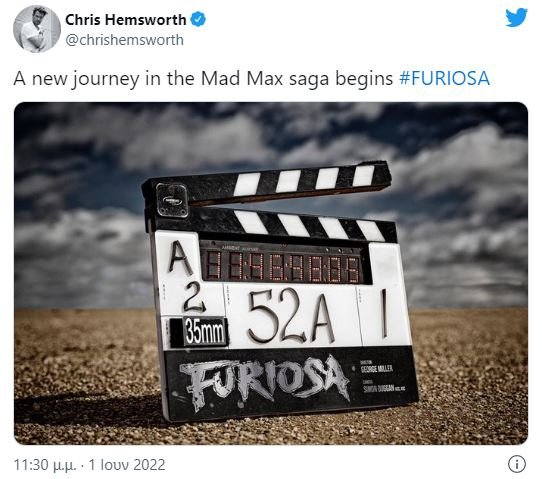 Με τη φωτογραφία μίας κλακέτας στη γνώριμη έρημο του Mad Max και φόντο τα σύννεφα, στην οποία αναφέρεται το όνομα του σκηνοθέτη Τζορτζ Μίλερ, όπως και η πληροφορία ότι η ταινία θα γυριστεί σε 35mm, ο Χέμσγουορθ έγραψε: «ένα νέο ταξίδι ξεκινά στο saga του Mad Max».