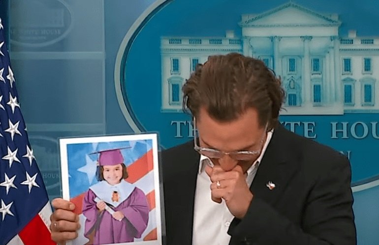 Ο 52χρονος ηθοποιός εμφανίστηκε στην ενημέρωση των δημοσιογράφων, κρατώντας φωτογραφίες ορισμένων από τα παιδιά που σκοτώθηκαν στο Ουβάλντε. Μίλησε για τις οικογένειές τους, τι φορούσαν την ημέρα που δολοφονήθηκαν και τι ήθελαν να γίνουν όταν θα μεγάλωναν. Αρκετές φορές έμοιαζε σαν να έχει έναν κόμπο στον λαιμό ενώ χτύπησε τη γροθιά του στο τραπέζι τη στιγμή που διάβαζε τα βιογραφικά στοιχεία των θυμάτων.