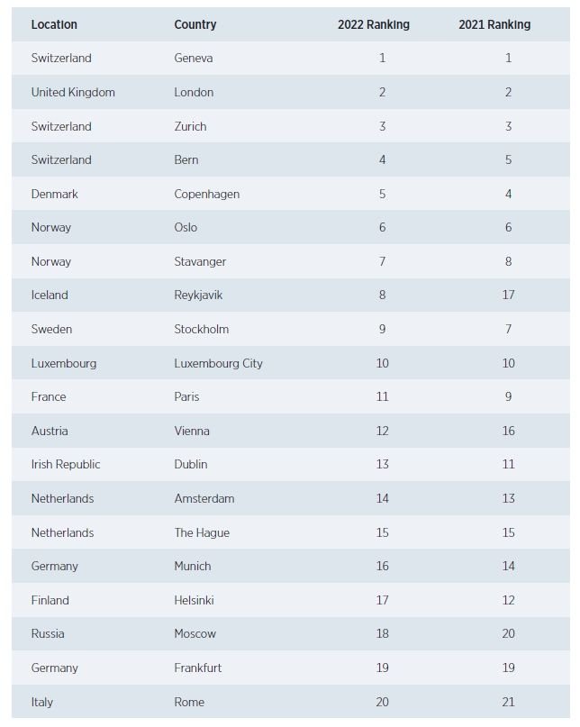 Η πιο ακριβή πόλη της Ευρώπης για ξένους εργαζόμενους, είναι η Γενεύη, αλλά ας σημειωθεί ότι η Ελβετία χρησιμοποιεί φράγκα και όχι ευρώ.