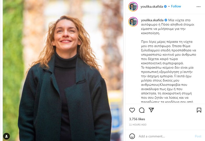«Μία νύχτα στο αυτόφωρο ή πόσο αληθινά έτοιμοι είμαστε να μιλήσουμε για την κακοποίηση. Πριν λίγες μέρες πέρασα τη νύχτα μου στο αυτόφωρο. Έπεσα θύμα ξυλοδαρμού επειδή προσπάθησα να υπερασπιστώ κοντινό μου άνθρωπο που δέχεται καιρό τώρα κακοποιητική συμπεριφορά. Το παρακάτω κείμενο δεν είναι μία προσωπική εξομολόγηση γι’ αυτήν την άσχημη εμπειρία. Γι’ αυτά έχω μιλήσει στους δικούς μου ανθρώπους: Κλειστοφοβία που ανακάλυψα πως έχω ή που απέκτησα, τη σοκαριστική στιγμή που σου ζητάν να λύσεις και να παραδώσεις τα κορδόνια σου από φόβο μήπως κάνεις κακό στον εαυτό σου, τη μυρωδιά και τα σκοτάδια ενός παγωμένου δωματίου που θα κουβαλάω μέσα μου για καιρό ακόμα.