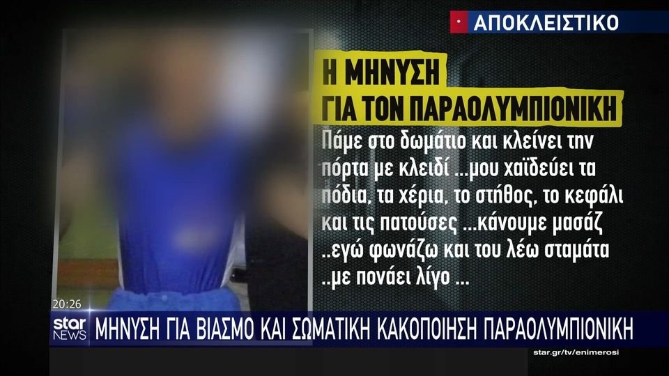 Οι γονείς ενός 22χρονου Παραολυμπιονίκη κατέθεσε μήνυση για βιασμό και σωματική κακοποίηση κατά ενός εκπαιδευτικού και ενός υπαλλήλου σε εκπαιδευτικό ίδρυμα όπου φοιτούσε.