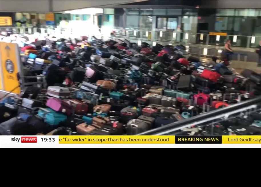 Τις χαοτικές σκηνές με εκατοντάδες βαλίτσες στοιβαγμένες έξω από έναν τερματικό σταθμό στο πιο πολυσύχναστο αεροδρόμιο του Ηνωμένου Βασιλείου, κατέγραψε δημοσιογράφος του Sky News.