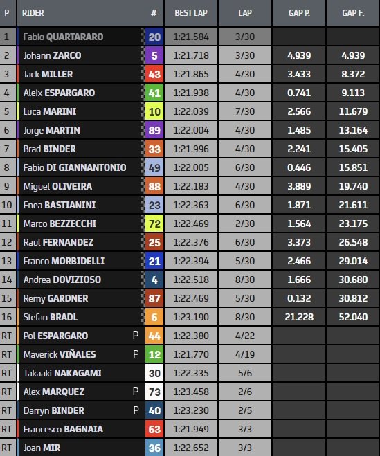 Συγκεκριμένα, ο Κουαρταραρό έχει πλέον 172 βαθμούς, με τον Εσπαργκαρό να ακολουθεί με 138, ενώ 111 έχει ο τρίτος Ζαρκό. Ο επόμενος αγώνας θα γίνει στις 26 Ιουνίου στο Άσεν της Ολλανδίας.