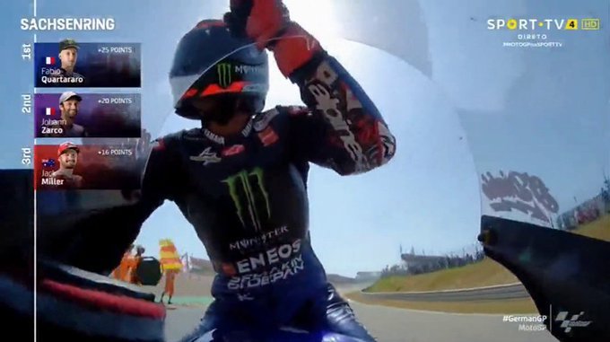Την τρίτη του νίκη στο φετινό Moto GP και δεύτερη συνεχή πανηγύρισε ο Φάμπιο Κουαρταραρό. Ο Γάλλος αναβάτης της Yamaha κυριάρχησε στην πίστα του Ζάχσενρινγκ στη Γερμανία, μπροστά από τις δύο Ducati, των Ζοάν Ζαρκό (+4.939) και Τζακ Μίλερ (+8.372).