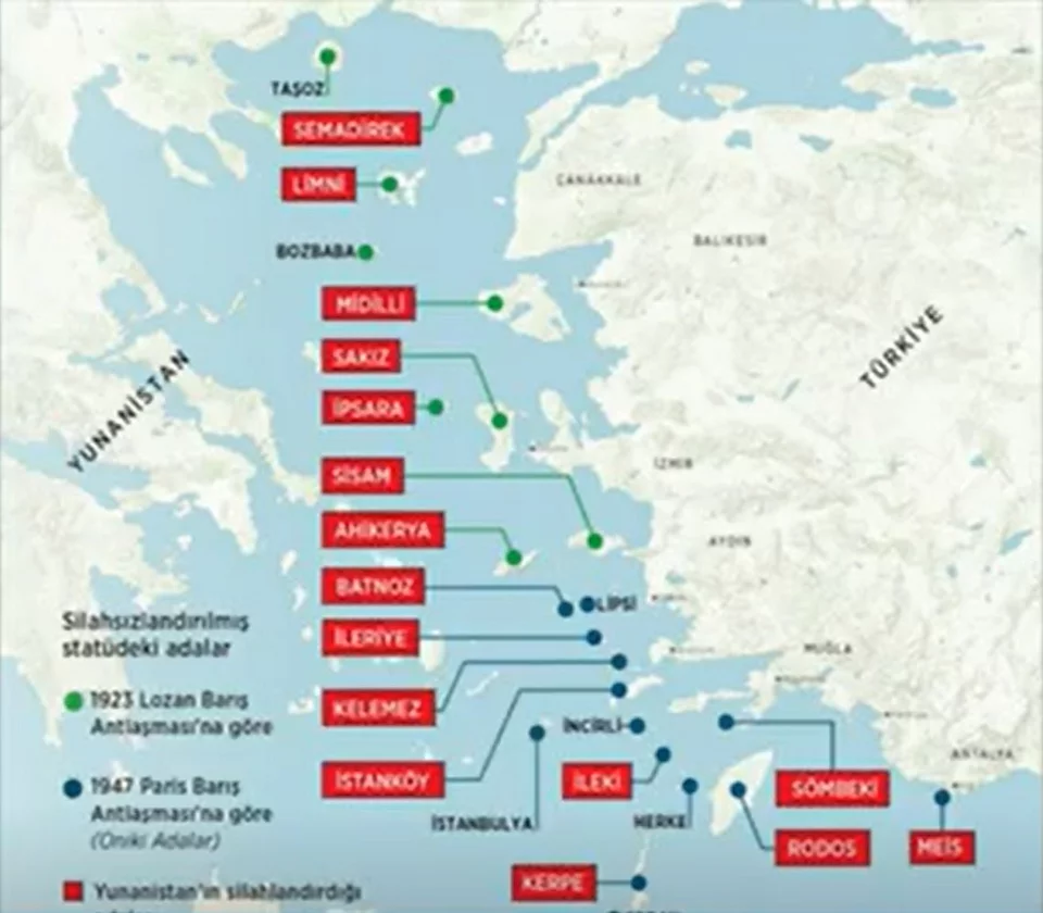 Υπενθυμίζεται ότι ο Μεβλούτ Τσαβούσογλου τόνισε πρόσφατα ότι αν η Ελλάδα δεν αποστρατιωτκοποιήσει τα νησιά, δηλαδή δεν αποσύρει όλα τα στρατεύματα από αυτά, τότε θα αμφισβητηθεί η κυριαρχία τους. Ο χάρτης-πρόκληση που ακολουθεί δείχνει τα νησιά που ζητά η Τουρκία να αποστρατιωτκοποιηθούν. Στον χάρτη περιλαμβάνονται νησιά όπως ο Λήμνος, η Λέσβος, η Θάσος, η Ρόδος, το Καστελλόριζο και πολλά άλλα νησιά του Αιγαίου.