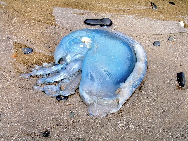 Οι Rhizostoma pulmo, όπως είναι το επιστημονικό τους όνομα, είναι μεγάλες σε μέγεθος. Η διάμετρος της καμπάνας του μπορεί να φτάσει μέχρι και τα 90 εκατοστά και τις βλέπουμε είτε με λευκό ή είτε με μπλε χρώμα, ενώ έχουν πάντα μια μωβ λωρίδα περιμετρικά στο άκρο της καμπάνας τους.