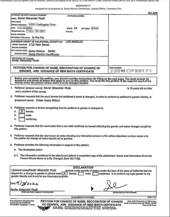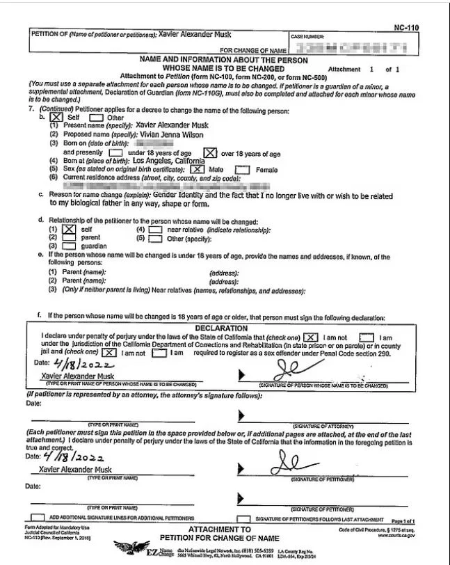 Η 18χρονη transgender, η οποία λεγόταν Xavier Musk, κατέθεσε τα δικαστικά έγγραφα στη Σάντα Μόνικα της Καλιφόρνια στις 18 Απριλίου, ζητώντας αλλαγή ονόματος. Το TMZ ανέφερε ότι το πλήρες όνομά της θα είναι Vivian Jenna Wilson, παίρνοντας το επώνυμο της μητέρας της, και ότι «θέλει να αναγνωριστεί ως γυναίκα».
