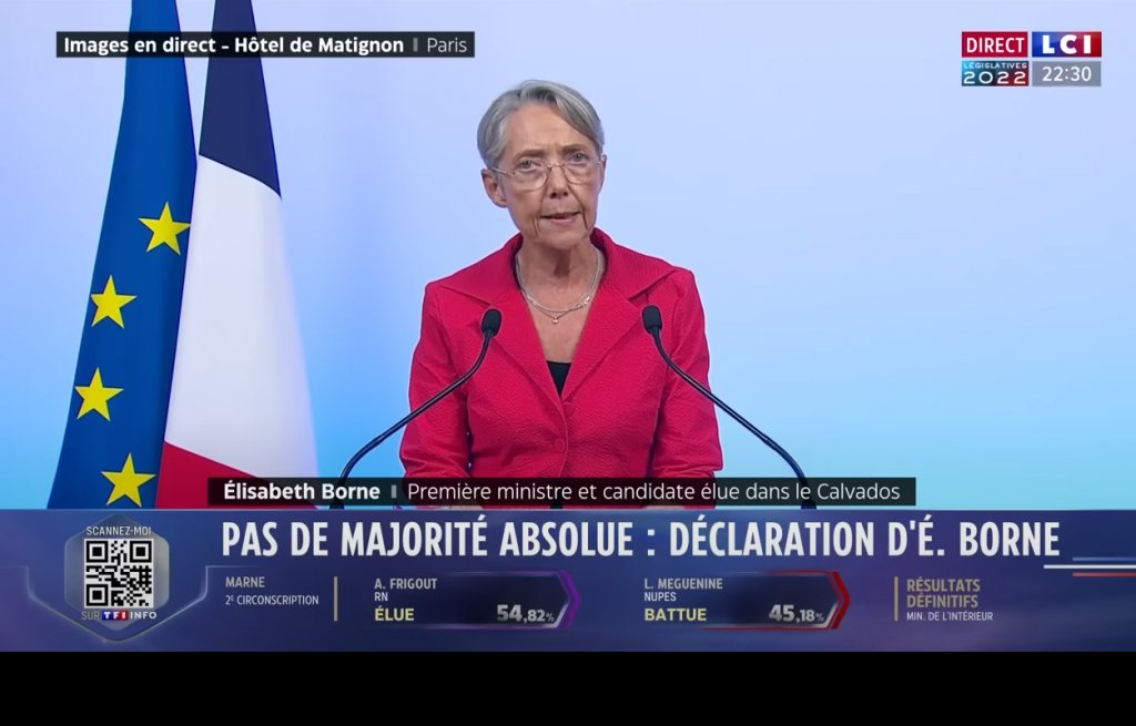 Όπως ανέφεραν χθες τα γαλλικά μέσα, η αριστερή συμμαχία NUPES, υπό τον Ζαν-Λουκ Μελανσόν, καθώς και το κεντροαριστερό Σοσιαλιστικό Κόμμα, θα καταθέσουν πρόταση μομφής κατά της κυβέρνησης της πρωθυπουργού της Γαλλίας στις 5 Ιουλίου, στη νέα Εθνοσυνέλευση, οπότε και θα κάνει την προγραμματική της ομιλία.