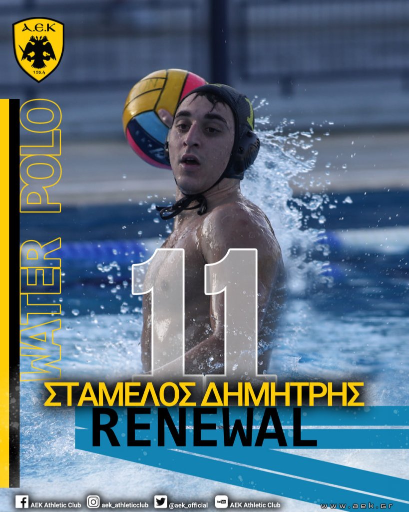«Η ΑΕΚ βρίσκεται στην ευχάριστη θέση να ανακοινώσει την ανανέωση της συνεργασίας της με τον Δημήτρη Σταμέλο. Ο 21χρονος (30/03/2001) περιφερειακός, ύψους 1,80 μ., θα παραμείνει στο δυναμικό της ανδρικής ομάδας Πόλο του Συλλόγου για ακόμα ένα έτος.