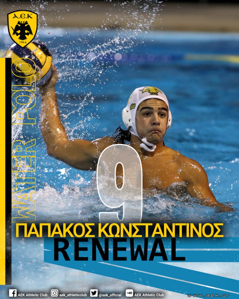 «Η ΑΕΚ βρίσκεται στην ευχάριστη θέση να ανακοινώσει την ανανέωση της συνεργασίας της με τον Κωνσταντίνο Παπάκο. Ο 20χρονος περιεφερειακός θα παραμείνει στο δυναμικό της ανδρικής ομάδας Πόλο του Συλλόγου για ακόμα ένα έτος.