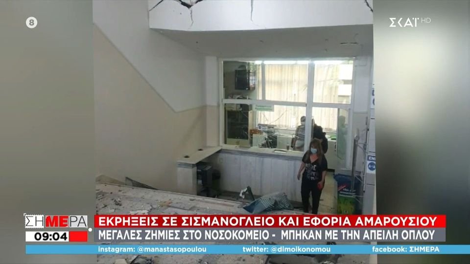Η έκρηξη ήταν ισχυρή και έχει προκαλέσει φθορές τόσο στο ισόγειο όσο και στον πρώτο όροφο του νοσοκομείου ενώ θραύσματα έφτασαν έως και τα πίσω γραφεία, 30 με 40 μέτρα μακριά.