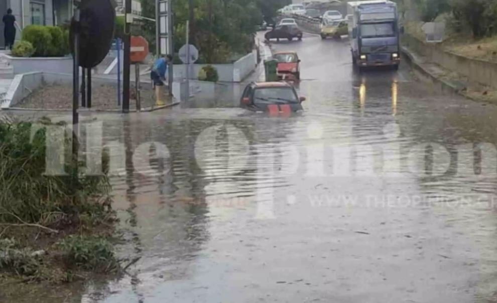 Από την ισχυρή νεροποντή, ένα αμάξι σχεδόν εξαφανίστηκε (!) στην οδό Ψελλού, στην ανατολική είσοδο της πόλης, λίγο πριν τη γέφυρα της Βούλγαρη.