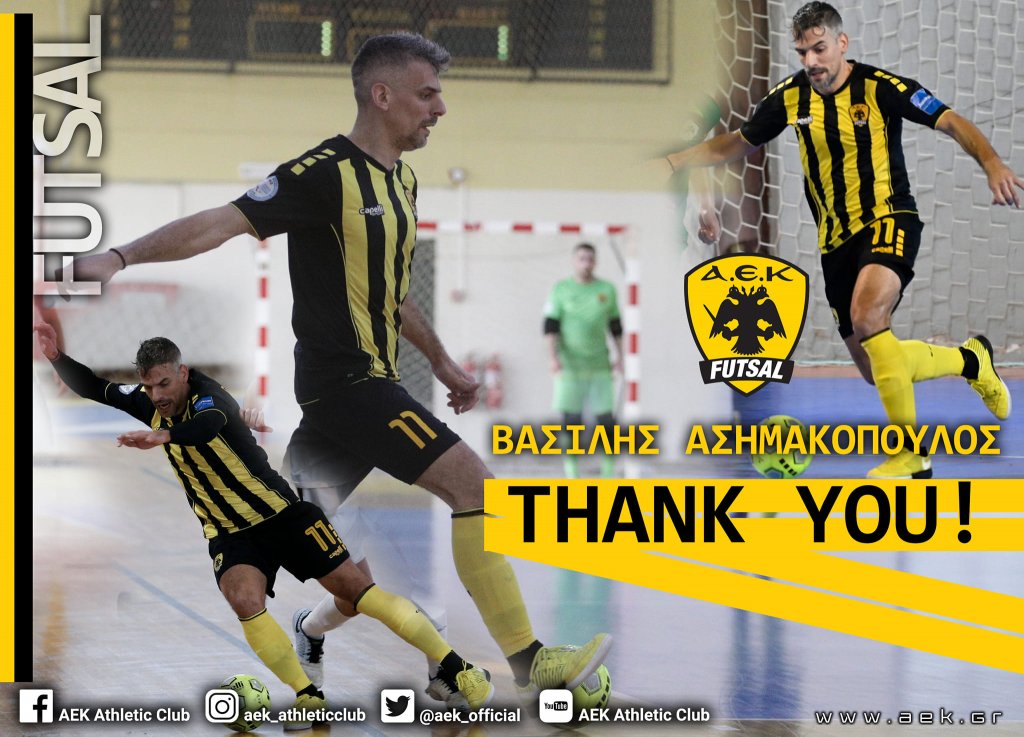 Η ΑΕΚ ανακοινώνει την ολοκλήρωση της συνεργασίας της με τον Βασίλη Ασημακόπουλο και του εύχεται καλή συνέχεια στην καριέρα του. Ο Βασίλης Ασημακόπουλος αποτέλεσε μέλος της ανδρικής ομάδας Futsal από το 2016 έως και σήμερα, συμβάλλοντας τα μέγιστα στην κατάκτηση 2 Πρωταθλημάτων, 1 Κυπέλλου και 2 Σούπερ Καπ, καθώς και στη μεγάλη ευρωπαϊκή πορεία έως τους «32» του Champions League.