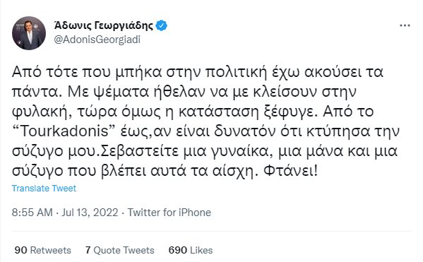 «Από τότε που μπήκα στην πολιτική έχω ακούσει τα πάντα. Με ψέματα ήθελαν να με κλείσουν στην φυλακή, τώρα όμως η κατάσταση ξέφυγε. Από το “Tourkadonis” έως, αν είναι δυνατόν, ότι κτύπησα την σύζυγο μου. Σεβαστείτε μια γυναίκα, μια μάνα και μια σύζυγο που βλέπει αυτά τα αίσχη. Φτάνει!», έγραψε ο Άδωνις Γεωργιάδης.