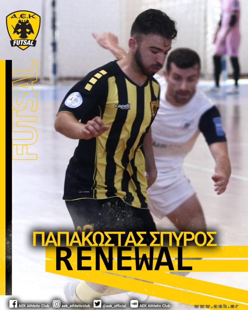 «Η ΑΕΚ βρίσκεται στην ευχάριστη θέση να ανακοινώσει την ανανέωση της συνεργασίας της με τον Σπύρο Παπακώστα. Ο 22χρονος (04/07/2000) διεθνής αθλητής θα παραμείνει στο δυναμικό της ανδρικής ομάδας Futsal του Συλλόγου για ακόμα ένα έτος.