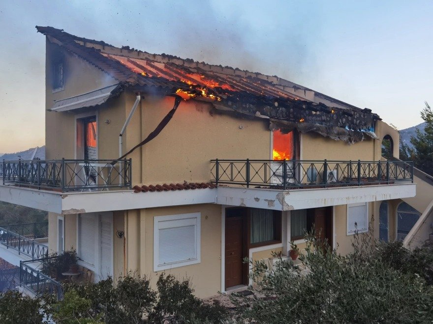 Όπως φαίνεται από το υλικό του protothema.gr, ένα σπίτι τυλίχθηκε στις φλόγες και στην Ανθούσα δείχνοντας πόσο δύσκολη παραμένει η κατάσταση.