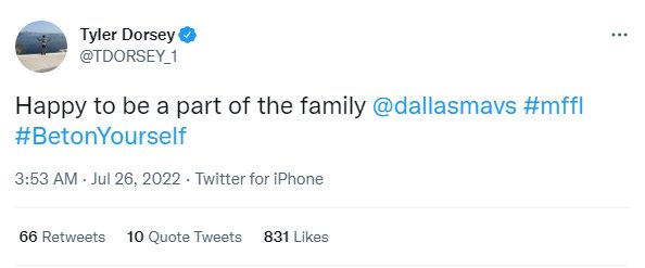 Με hastag "πόνταρε στον εαυτό σου", ο 26χρονος γκαρντ έγραψε στο Twitter "Χαρούμενος που είμαι μέρος της οικογένειας των Ντάλας Μάβερικς", με την ομάδα του Ντάλας να απαντά, στα σχόλια, καλωσορίζοντας τον Ντόρσεϊ στο δυναμικό της.