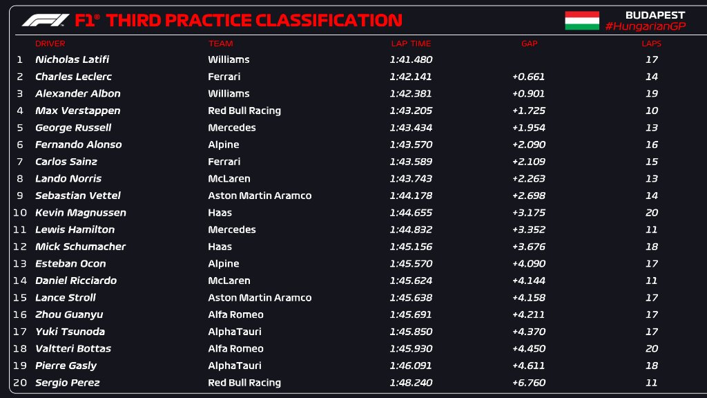 Έξι δέκατα του δευτερολέπτου πίσω του τερμάτισε ο Σαρλ Λεκλέρκ της Ferrari, ενώ ο Άλεξ Άλμπον, επίσης της Williams, βρέθηκε στην τρίτη θέση και ο Μαξ Φερστάπεν στην τέταρτη.