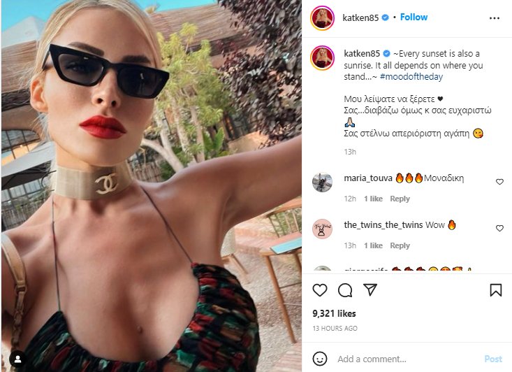 Στη συγκεκριμένη ανάρτηση, μια follower της έγραψε: «Το στήθος είναι όλο ξένο. Κραυγάζει!!», με την παρουσιάστρια να της απαντά: «Εσύ το πλήρωσες; Όχι… εγώ!!! Κι επίσης δεν το έχω κρύψει… πόσο σεξιστικό σχόλιο, ειδικά από Γυναίκα».