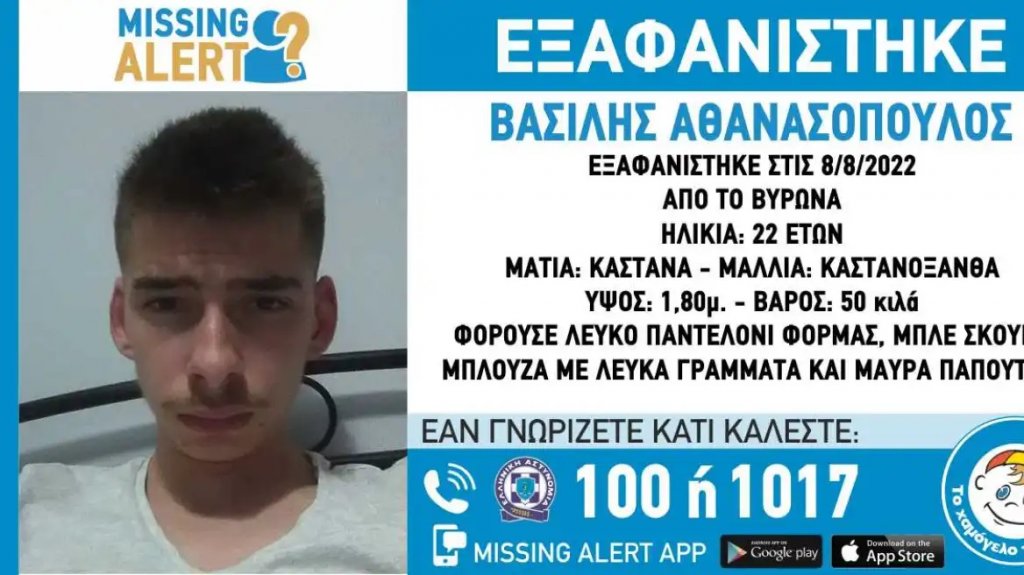 Εξαφανίστηκε από την περιοχή του Βύρωνα Αττικής στη Δευτέρα 8 Αυγούστου ο 22χρονος Βασίλης Αθανασόπουλος, προκαλώντας ανησυχία στους δικούς του ανθρώπους.