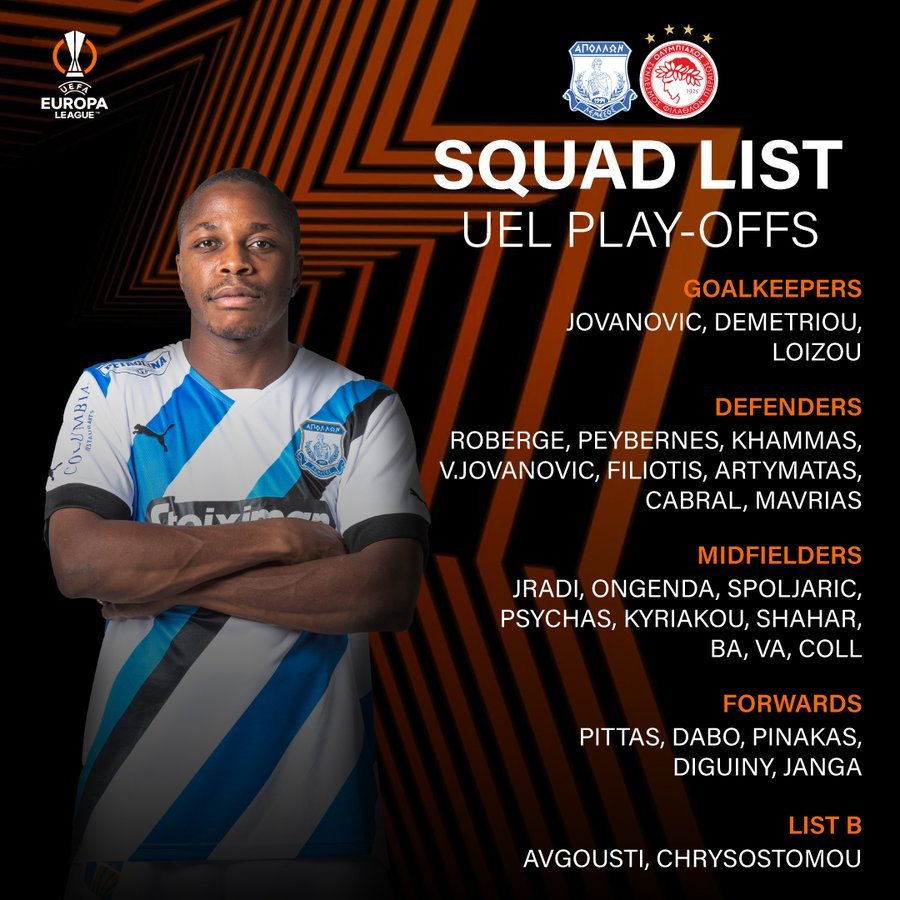 Ο Απόλλων Λεμεσού έκανε γνωστή και τη λίστα που κατέθεσε στην UEFA, με τους ποδοσφαιριστές που θα είναι διαθέσιμοι για τις προσεχείς αναμετρήσεις με τον Ολυμπιακό για τα playoffs του Europa League.