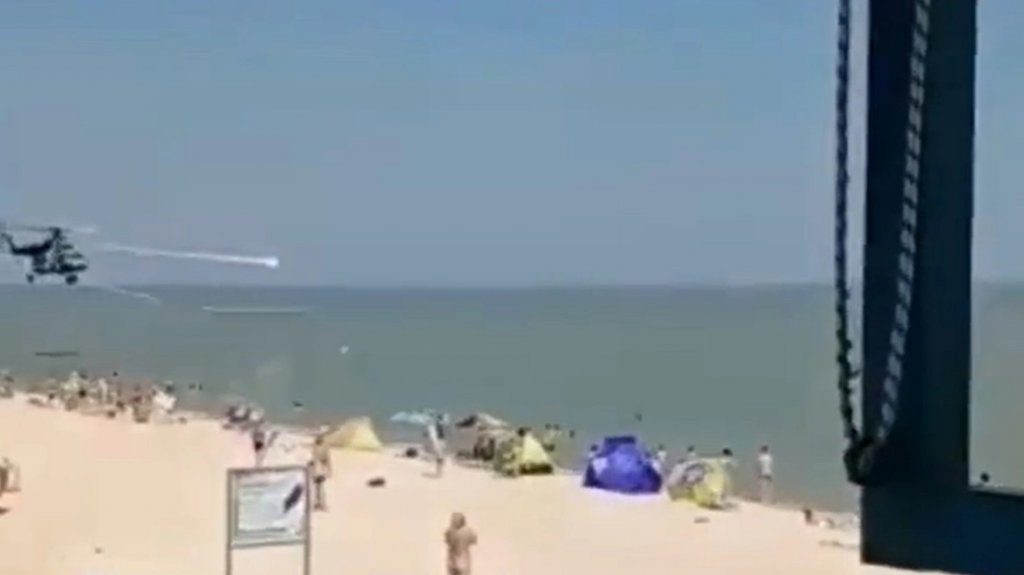 Russian helicopters fly over vacationers on the coast of Yevpatoria in occupied Crimea, launching active defense equipment right off the coast. A video from social networks. pic.twitter.com/7AwumXMvBa