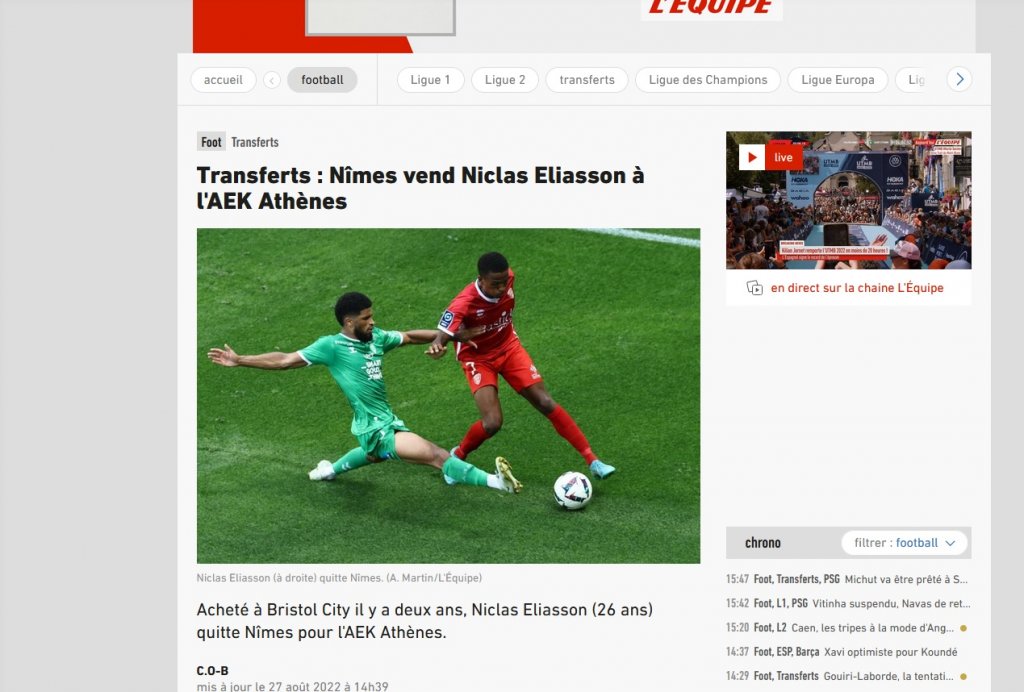Η ΑΕΚ προχωρά σε μια σπουδαία κίνηση, όπως διαβάσατε νωρίς το μεσημέρι, με την αγορά του Νίκλας Ελίασον από τη Νιμ έναντι 2 εκ. ευρώ. Η είδηση ήδη παίζει σε κορυφαία γαλλικά ΜΜΕ όπως η Lequipe, που καταγράφει τα δεδομένα για τον διεθνή Σουηδό εξτρέμ. «Ο Νίκλας Ελίασον που αγοράστηκε από την Μπριστολ πριν δύο χρόνια, φεύγει από τη Νιμ με προορισμό την ΑΕΚ. Σύμφωνα με πληροφορίες μας, ο Ελίασον πουλήθηκε στην ΑΕΚ για €2 εκ. Την περασμένη σεζόν σε 36 παιχνίδια της Ligue 2 έκανε 7 γκολ και 7 ασίστ».