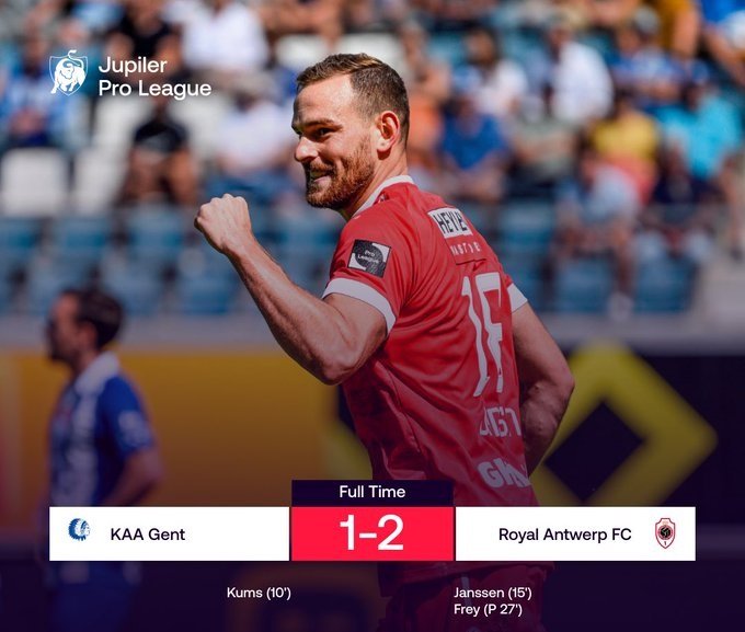 Η εξαιρετική φέτος Αντβέρπ πέρασε με 2-1 από τη Γάνδη και έκανε το 5Χ5. Με ένα ματς λιγότερο έπιασε στην κορυφή την Γκενκ. Οι γηπεδούχοι προηγήθηκαν με τον Κουμς στο 10ο λεπτό αλλά στο η Αντβέρπ αντέδρασε άμεσα. Στο 15’ έκανε το 1-1 με τον Γιάνσεν. Τη νίκη έδωσε ο Φράι με εύστοχο χτύπημα πέναλτι ο Φράι.