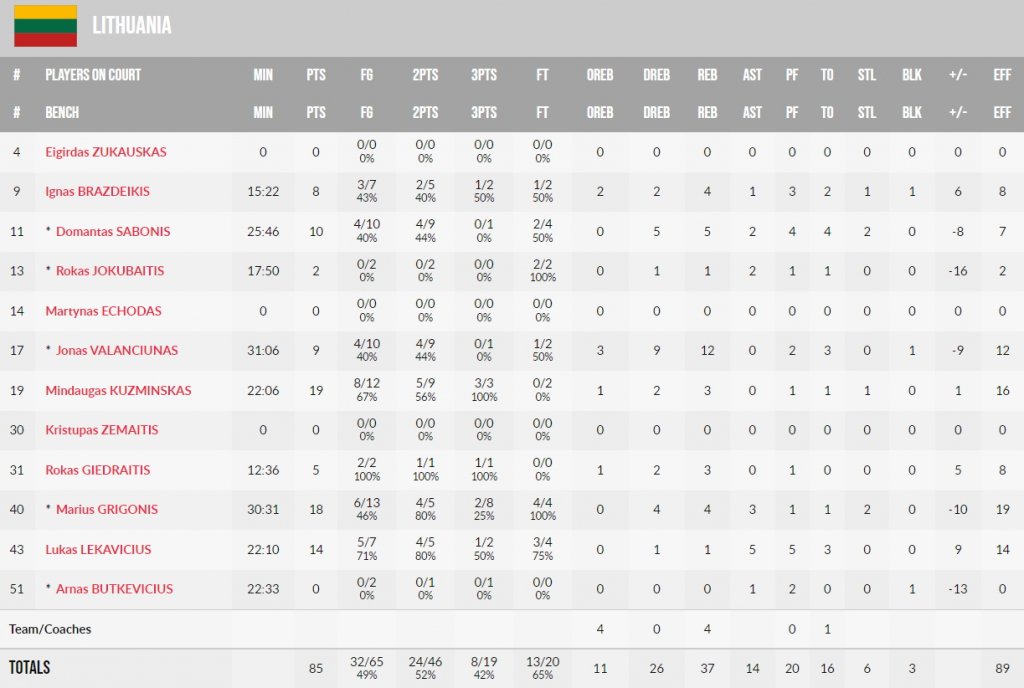 Από την άλλη, για τους Λιθουανούς ξεχώρισαν ο γκαρντ/φόργουορντ του Παναθηναϊκού, Μάριους Γκριγκόνις (18 πόντοι, 4 ριμπάουντ, 3 ασίστ), αλλά και ο Κουζμίνσκας (19 πόντοι).