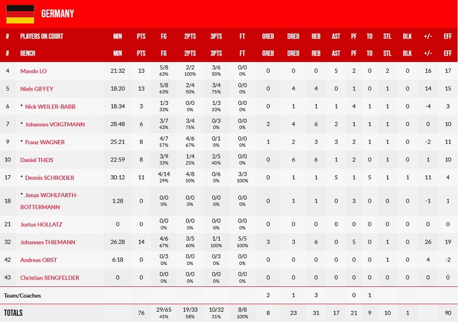 Κορυφαίος των Γερμανών ήταν ο Τίμαν με 14 πόντους, ενώ από 13π. είχαν οι Λο και Γκιφάι.