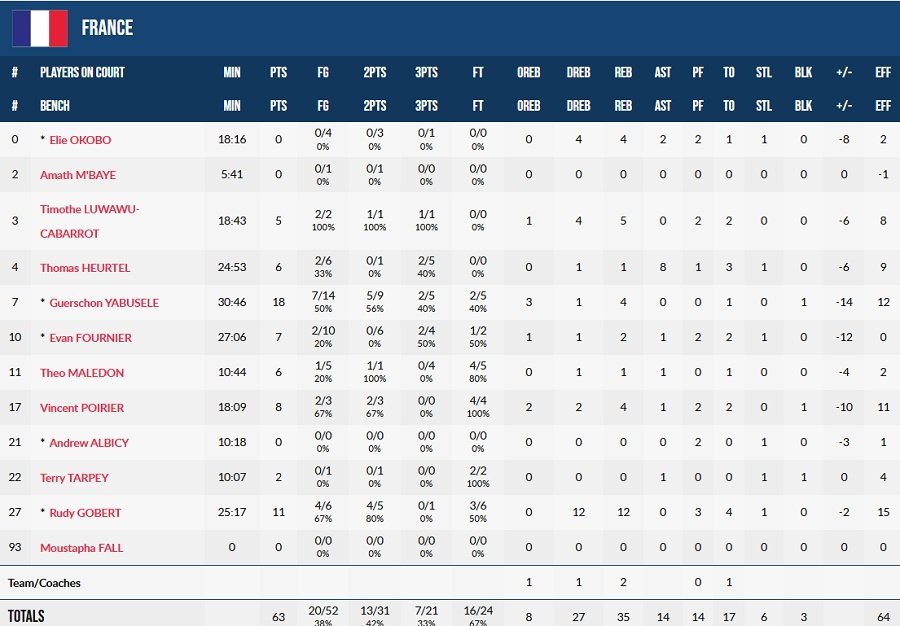 Από τους «τρικολόρ», ξεχώρισε ο Γκομπέρ με 18π. και ο Γιαμπουσέλι, ο οποίος έκανε νταμπλ-νταμπλ 11π. και 12 ριμπάουντ.