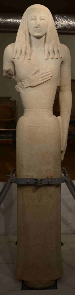 Η υπερφυσικού μεγέθους αρχαϊκή κόρη από λευκό ναξιώτικο μάρμαρο, ύψους 2,48 μ. με τον σύμφυτο γόμφο ένθεσης στη βάση του, είναι σχεδόν ακέραιη. Το γλυπτό, από το οποίο λείπει μόνο η άκρη της μύτης και ο βραχίονας του λυγισμένου δεξιού χεριού που ακουμπά στο στήθος, αποτελεί ένα από τα λιγοστά έργα της μεγάλης, σε λίθο, περίοπτης πρώιμης ελληνικής πλαστικής που διασώθηκαν μέχρι τις μέρες μας, η οποία εκφράζεται με τους αγαλματικούς τύπους του κούρου και της κόρης, τις αρχετυπικές αυτές εκφράσεις του κάλλους της εποχής. Το άθικτο, σχεδόν, άγαλμα της ενδεδυμένης με μακρύ δωρικό πέπλο γυναικείας μορφής συμπληρώνει με μοναδικό τρόπο τις γνώσεις μας για τον τύπο της κόρης στο β’ μισό του 7ου αι. π.Χ., καθώς η άρτια διατήρησή του αναδεικνύει τα τεχνοτροπικά του χαρακτηριστικά και την μοναδική καλλιτεχνική του αξία.