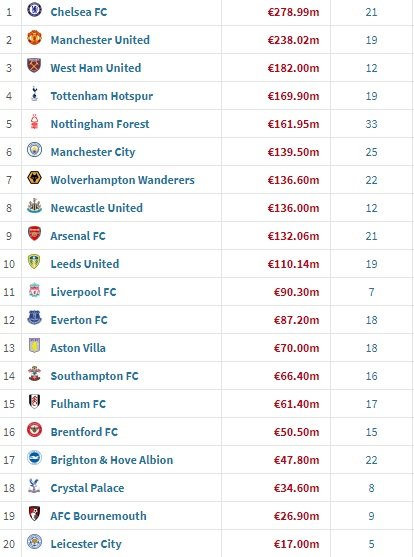 Τα περισσότερα χρήματα για μεταγραφές διέθεσε η Τσέλσι, 278,99 εκατ. ευρώ, ενώ ακολούθησαν η Μάντσεστερ Γιουνάιτεντ (238 εκατ.), η Γουέστ Χαμ (182 εκατ.), Τότεναμ (169,9 εκατ.) και η Νότιγχαμ (161,95 εκατ.). Τα λιγότερα χρήματα, μόλις 17 εκατ. ευρώ, διέθεσε η Λέστερ.