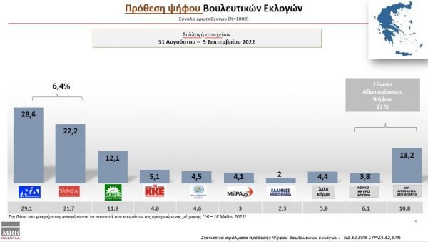 Φθορά για την κυβέρνηση, στασιμότητα του ΣΥΡΙΖΑ και μικρή άνοδο για το ΠΑΣΟΚ καταγράφει δημοσκόπηση της MRB. Η διαφορά ΝΔ-ΣΥΡΙΖΑ πέφτει στις 6,4 μονάδες καθώς το κυβερνών κόμμα συγκεντρώνει 28,6% και αυτό της αξιωματικής αντιπολίτευσης 22,2%. Τρίτο το ΠΑΣΟΚ με 12,1%. Το ΚΚΕ βρίσκεται στο 5,1%, η Ελληνική Λύση 4,5% και το ΜεΡΑ25 στο 4,1%.